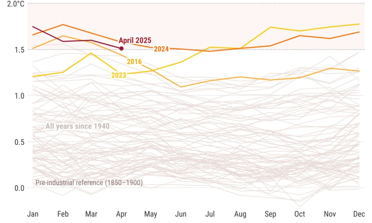 “Globally, April 2025 was the second-hottest April on record, continuing the long sequence of months over 1.5ºC above pre-industrial.”